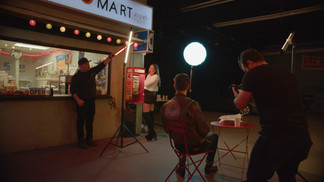 The space features a scene that has a ramen bar, a full convenience store, a street lamp, pay phone, and a set of TVs that can play whatever you upload (which gave me a fantastic idea). While I was studying the space online, I saw these TVs and thought that we could film Jules singing to the camera, bringing another element into this music video.
